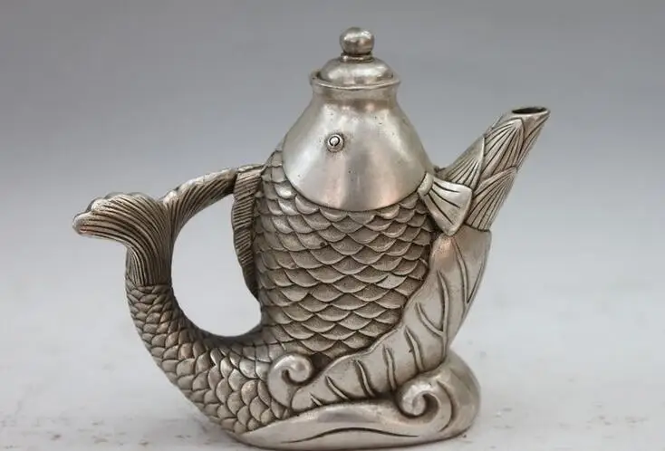 BEST QUALITY China White Copper Silver Bamboo Shoot Lucky Carp Fish Teapot Flagon wine pot