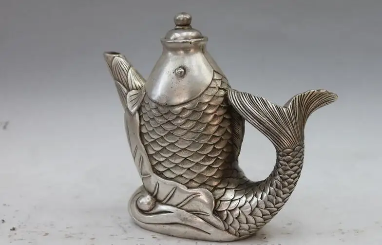 China White Copper Silver Bamboo Shoot Lucky Carp Fish Teapot Flagon wine pot