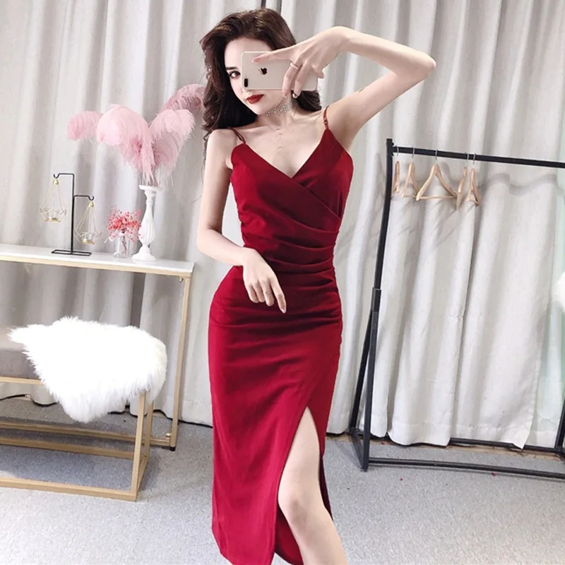 Hot Sale Photo Shoot ~ Careful Machine Sexy Camisole V-neck Waist Hugging Slit Irregular Mid-length Banquet