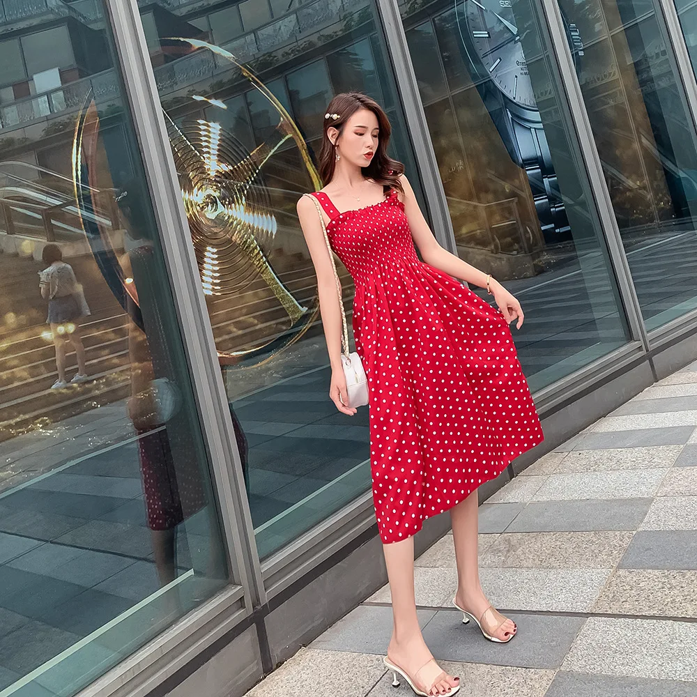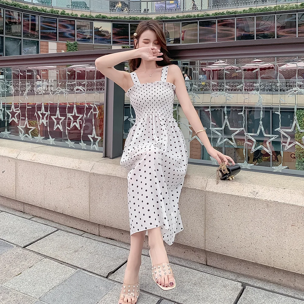 REVIEW TOP SELLER Photo Shoot Summer New Style Polka Dot Horizontal Neck Mid-length Dress Women's Korean-style Sweet