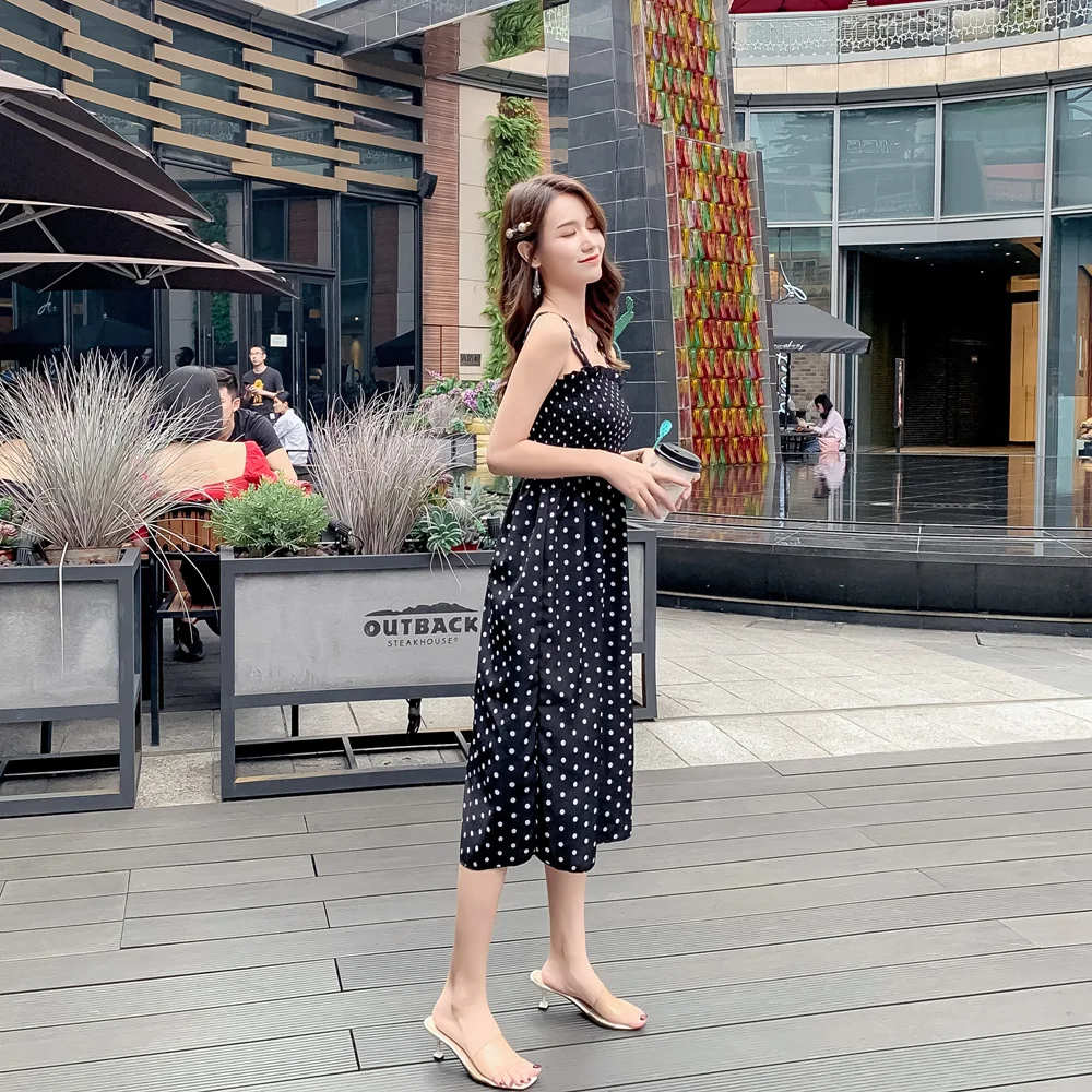 ORIGINAL Photo Shoot Summer New Style Polka Dot Horizontal Neck Mid-length Dress Women's Korean-style Sweet